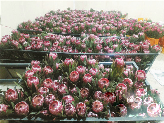 據了解,“公主”系列花材跟“王帝王”一樣均屬于帝王花屬植物,原產于南非。由于花形嬌小,不少人會誤以為是“王帝王”的雌花,而事實上帝王花屬植物大部分都是雌雄同株的,自己就可以完成授粉繁殖。“公主”系列花材其實是因為花形而由市場取的商品名,相比“王帝王”只是花形不同。該系列花材由“楊月季”公司從南非引進,目前國內只有該公司大量種植,上市品種有‘粉冰’、‘蘭斯洛特’、‘綠冰’、‘紅寶石’、‘塞爾維亞’、‘杏仁冰淇淋’等,由于品種不同,每個品種的花期會分散在不同的月份,從8月到第二年3月,“楊月季”公司均可供應帝王花屬花材。